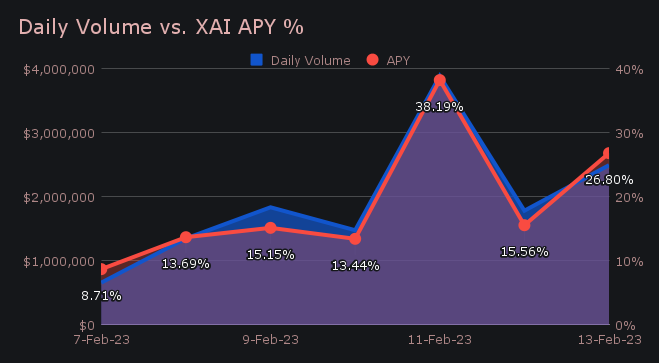 XAI stakers were rewarded with an average APY of 20.47% throughout the period, with a daily rewards high of 74,018.6 XAI (an APY of 38.19%) being deposited to our staking vault on February 11th, 2023. This was following a healthy daily volume of $3.88m. Over the course of the previous 7 days, the cumulative sum paid to stakers totalled $38,703.93 USD, or 270,997.88 XAI.