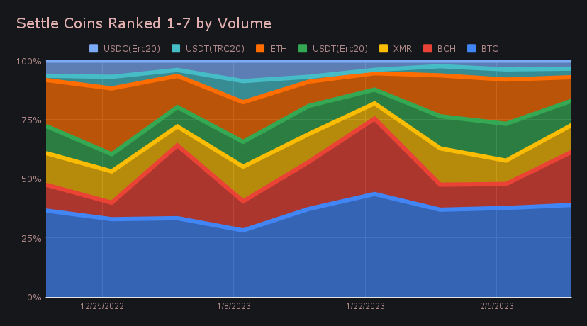 On the settlements side, the percentage changes in volume for our top 8 was a mixed bag - half of them increased, while the other half decreased. The top 3, which represent ⅔ of total settle volume, all saw increases. BTC led the way with $4.6m (+0.4%), while BCH placed second with $2.7m (+115%). You can note the ebb and flow in BCH settlements in the chart below. In third was XMR, growing 12.0% to finish with $1.4m. Conversely, after seeing an increase in demand last week, ETH fell sharply and dropped 48% to finish with $1.2m.