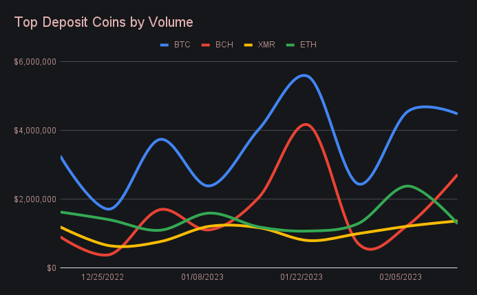 Aside from BCH, one of the few coins to also see an increase in deposit volume was XMR. It ranked as our third most deposited coin, growing 12.6% to net $1.4m. XMR repeatedly finishes among our top 3 coins, with deposit volume being fairly predictable as illustrated below. Also worth pointing out is the increase in BUSD deposits - this week growing 145% to net $148k. It was one of the only stablecoins to see an increase in activity week on week, and perhaps is related to the recent SEC FUD. Most recently, most BUSD deposits have been shifted into stablecoins on Ethereum, or Ethereum itself, although the volume hasn’t been significant as of yet. It is something we will keep our eye on in the coming weeks.