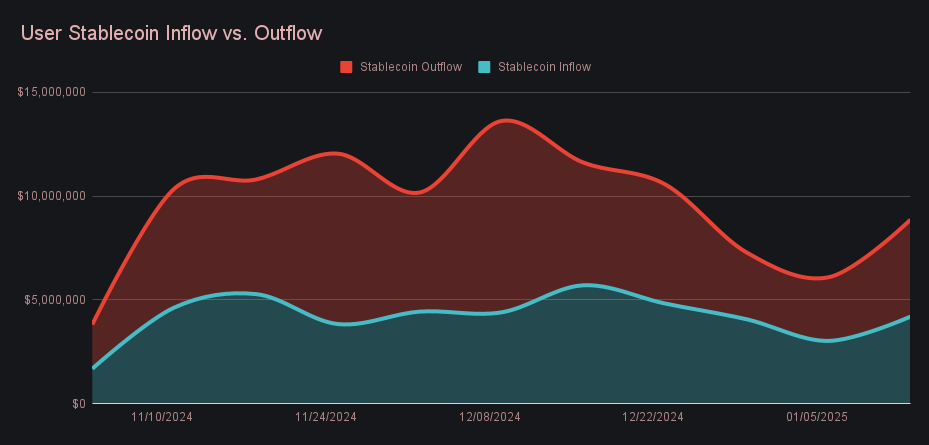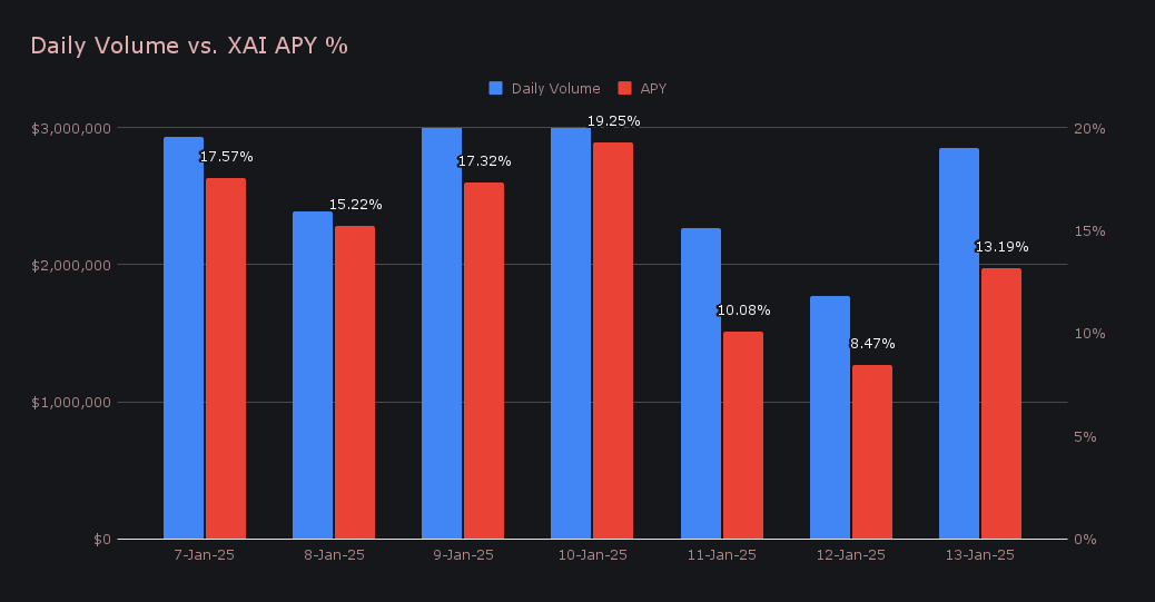XAI stakers earned an average APY of 14.44% this week, with a daily rewards high of 61,978.78 XAI (an APY of 19.25%) being distributed directly to our staking vault on January 11th, 2025. This peak aligned with a daily volume high of $4.3m, reflecting the strong connection between heightened platform activity and staking rewards. Altogether, XAI stakers received a total of 330,986.78 XAI or $54,534.66 USD in rewards throughout the week.
