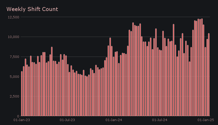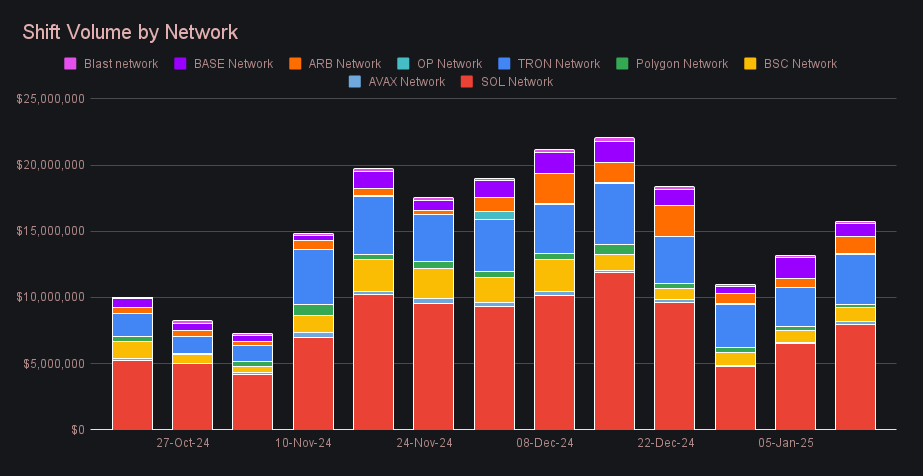 SideShift’s weekly shift count also saw a meaningful rise, reaching 10,447 shifts (+7.6%), regaining the significant 10k shifts per week milestone. This figure combined with our weekly volume to achieve healthy daily averages of $2.8m in volume across 1,492 shifts, highlighting the platform’s steady upwards trajectory to begin the year. This fact that this general uptick has unfolded despite oscillating price action showcases that a volatile market sets perfect conditions for SideShift.