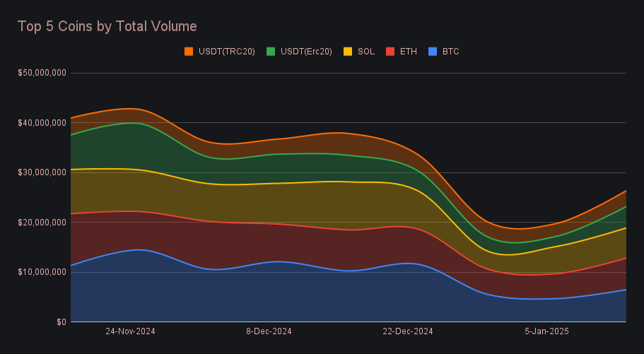 SOL secured third place with a weekly volume of $6.1m (+10.7%), maintaining its remarkable consistency in SideShift’s top three over recent months. While deposit volume dipped slightly to $2.0m (-5.8%), its settlement volume rose to $2.7m (+12.2%), and secured the title of the most demanded coin on SideShift for the second straight week. SOL’s recent popularity remains undeniable, having outperformed ETH in terms of total volume in six of the past eight weeks.