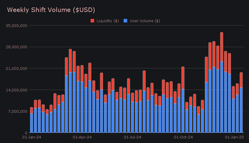 Last week saw SideShift record a notable gross weekly volume of $19.7m, marking a +23.1% increase from the previous period. This rise extends the ongoing growth trend, as our weekly volume has now climbed in consecutive weeks since New Years. This week’s breakdown came from a user shifting volume total which contributed $14.8m (+20.1%), while liquidity shifting grew at a faster rate and added a further $4.9m (+33.5%). A solid portion of this user shifting continues to stem from SOL, and particularly on the demand side, with ETH/SOL standing out as the top user shift pair for the second straight week with $766k. BTC/USDT (ERC-20) followed closely with $631k.