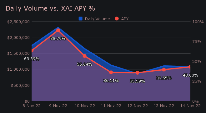 An incredibly volatile week led to strong daily volumes on SideShift, and resulted in an outstanding average APY of 51.87%. This is approximately 24% higher than our all time average, and is one of our highest weekly averages of 2022 so far. For stakers, a sum of 67,701.87 XAI was deposited to our staking vault on November 10th, 2022, following a net daily volume of $2.31m. This amounted to a superb daily APY of 88.79%.