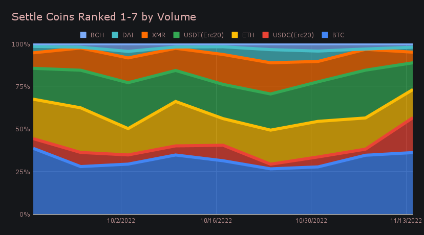 On the settle side, BTC dominated once again with a net settle volume of $3.19m (+86.5%) for the period. USDC on Ethereum roared into second place with more than a tenfold increase. It finished with $1.81m, $500k of which was shifted from USDT on Tron. ETH placed third with a very respectable $1.46m (+60.9%). You can visualize the sharp increase in USDC (ERC-20) settlements in the chart below.