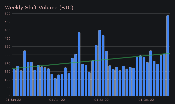In general news, SideShift had a solid but busy week. All in all we encountered few issues, with most issues that did arise being a result of the FTX meltdown. The most notable was a backlog of shifts occurring on November 10th, due to rate instability and huge market volatility. Our engineers responded quickly to the rates issue and found alternate solutions - all stuck shifts were settled within a couple of hours. Finally, a handful of ERC-20 tokens were disabled - CRO, SWEAT, TUSD, LOOKS for various reasons. These remain disabled for the time being.