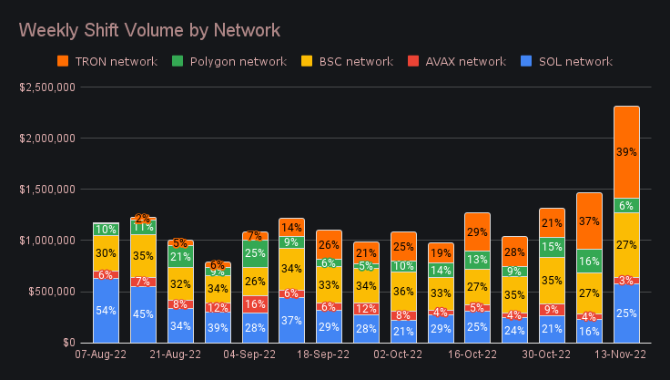 Networks other than Ethereum saw a significant rise of 58.2% and combined for a total volume of $2.31m. This is a solid increase, but still only about ⅓ of total volume when compared to the Ethereum network. Nevertheless, growth is evident and once again Tron shined in this category. For the second consecutive week, it was the most popular network among alternatives to Ethereum, with shifted coins on Tron totalling to a sum of $893k. This is almost entirely due to USDT (TRC-20) shifts. The BSC and SOL networks saw respective nominal increases of 58.4% and 154.7%, representing sizable growth. However, when looking at the proportion of total volume, they remain fairly similar to levels seen in recent weeks.