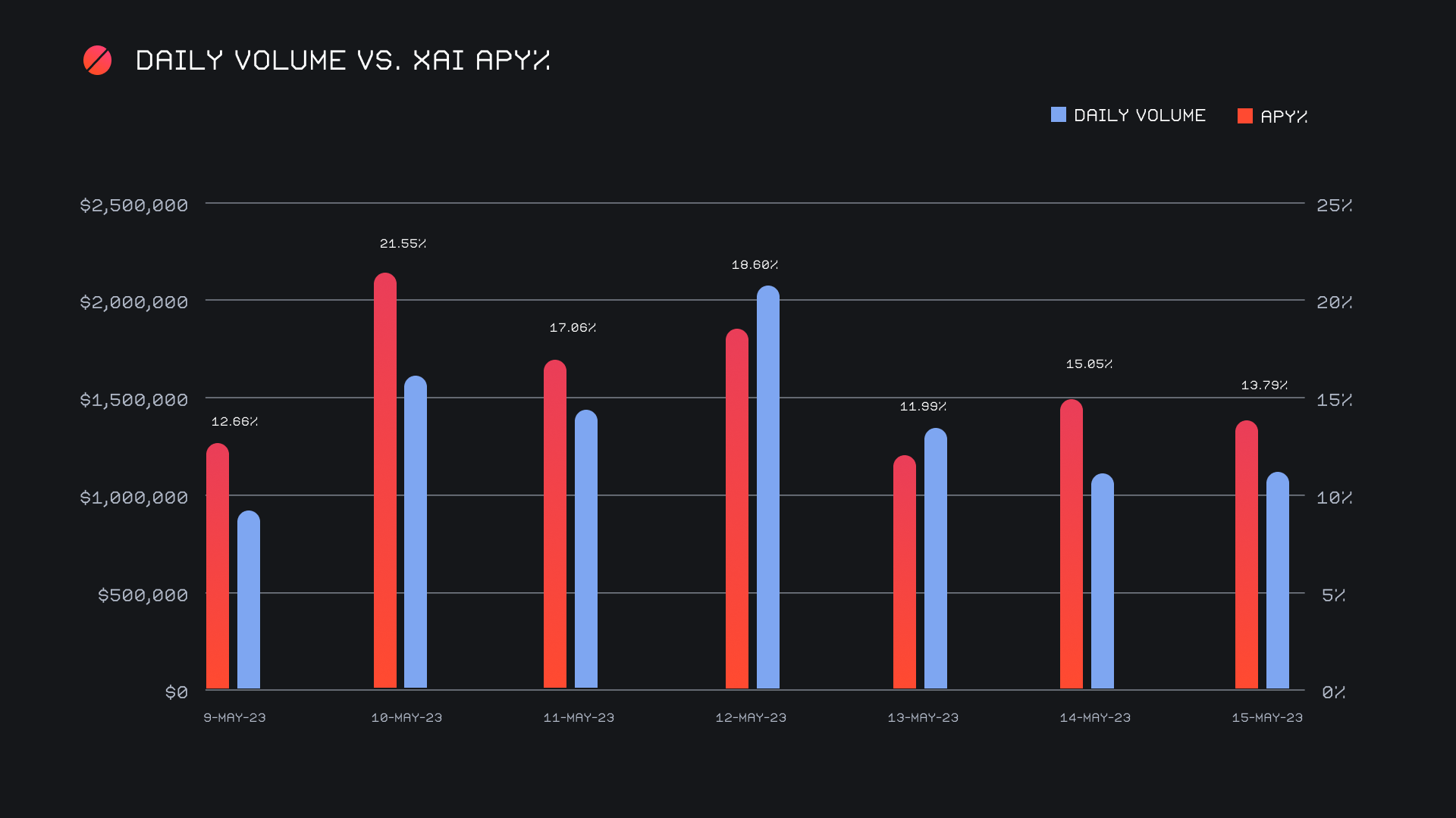 XAI stakers were rewarded with an average APY of 16.34% this week, with a daily rewards high of 52,360.23 XAI (an APY of 21.55%) being distributed to our staking vault on May 11, 2023. This was following a daily volume of $2.1m. As a whole, this week XAI stakers received a total of 275,255.83 XAI, or $31,982.18 USD in staking rewards.