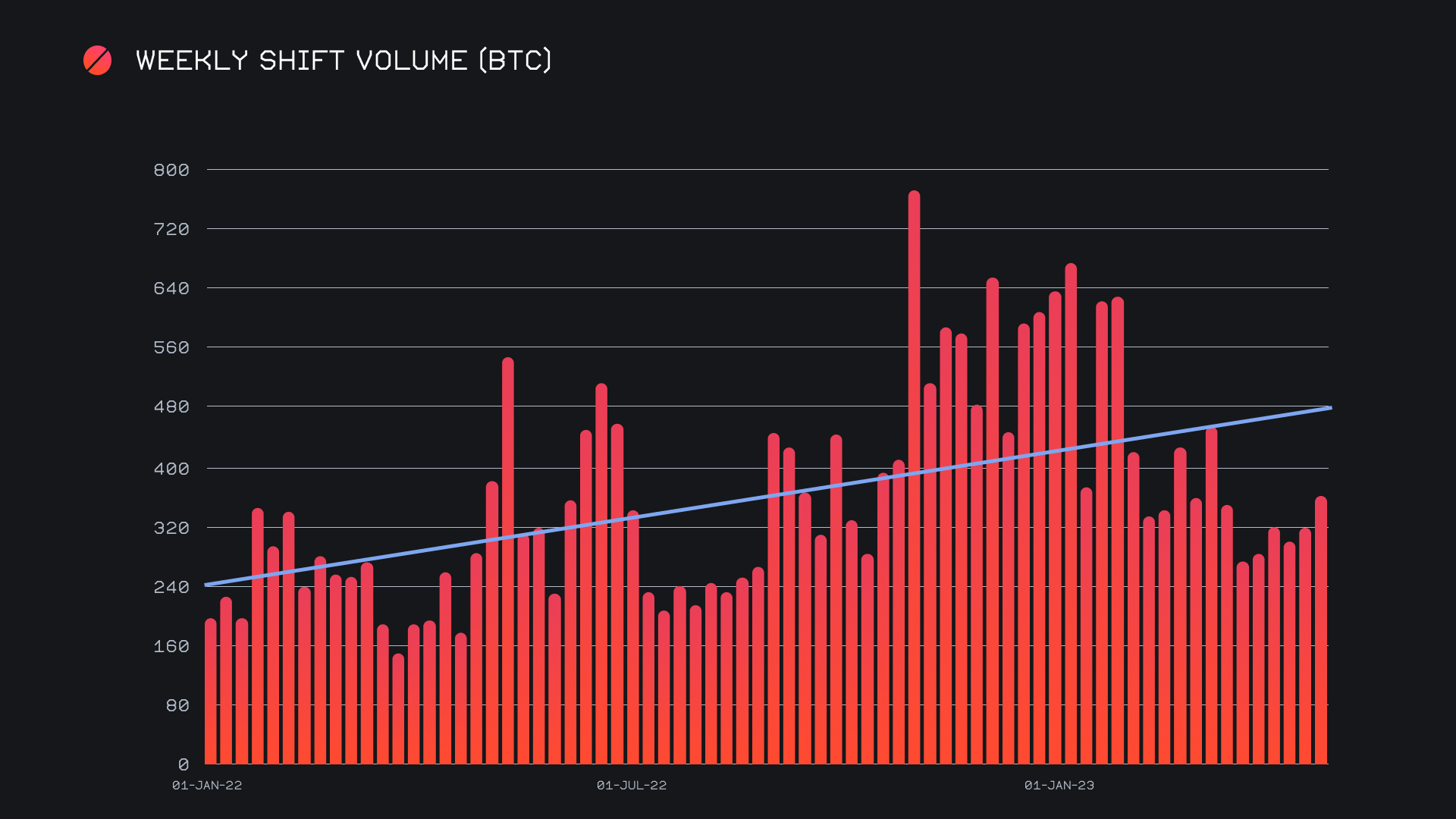 SideShift had a solid week, recording our highest volume in nearly 2 months. We ended the period with a gross volume of $9.7m (+7.6%) alongside a shift count of 6,939 (-0.8%). It is interesting to note that volume continues its gradual climb, despite the relative lull in shift count. Together, these figures combined to produce daily averages of $1.4m on 991 shifts. When denoted in BTC, our weekly volume increased 13.8%, for a total of 358.14 BTC.